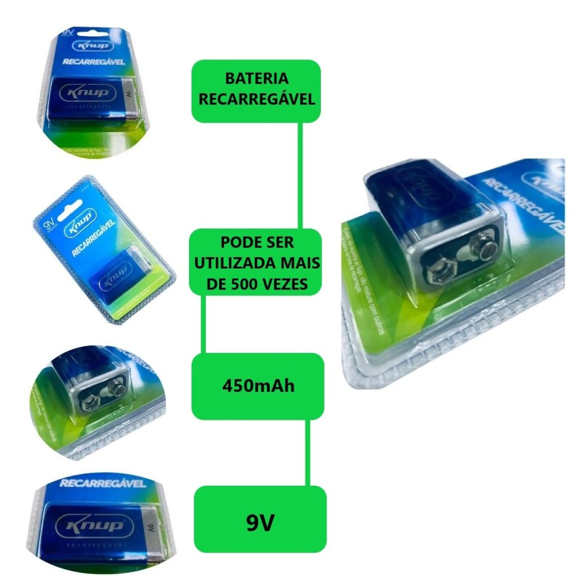 A bateria 9V KNUP pode ser utilizada mais de 500 vezes;