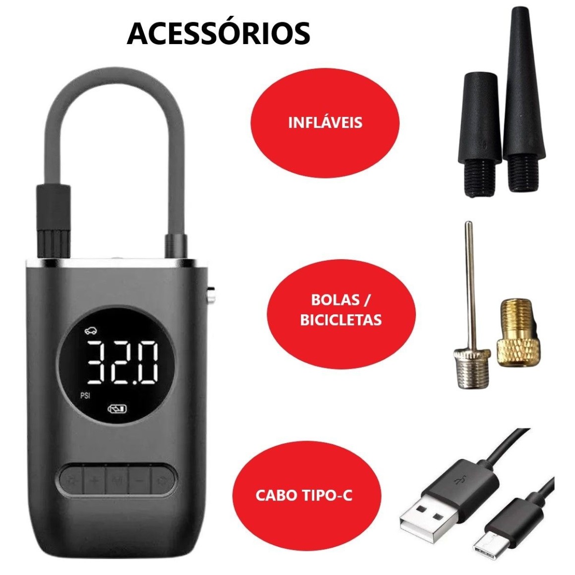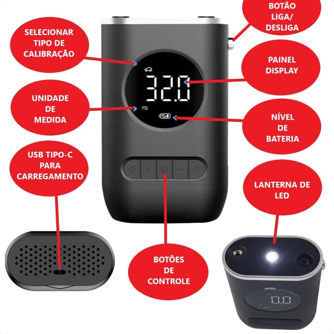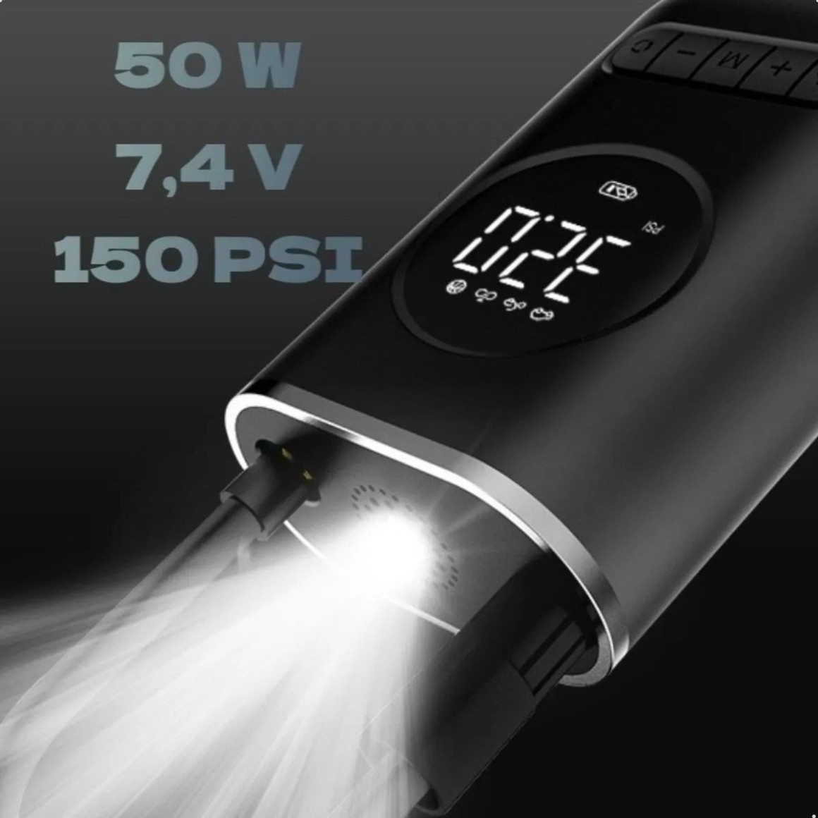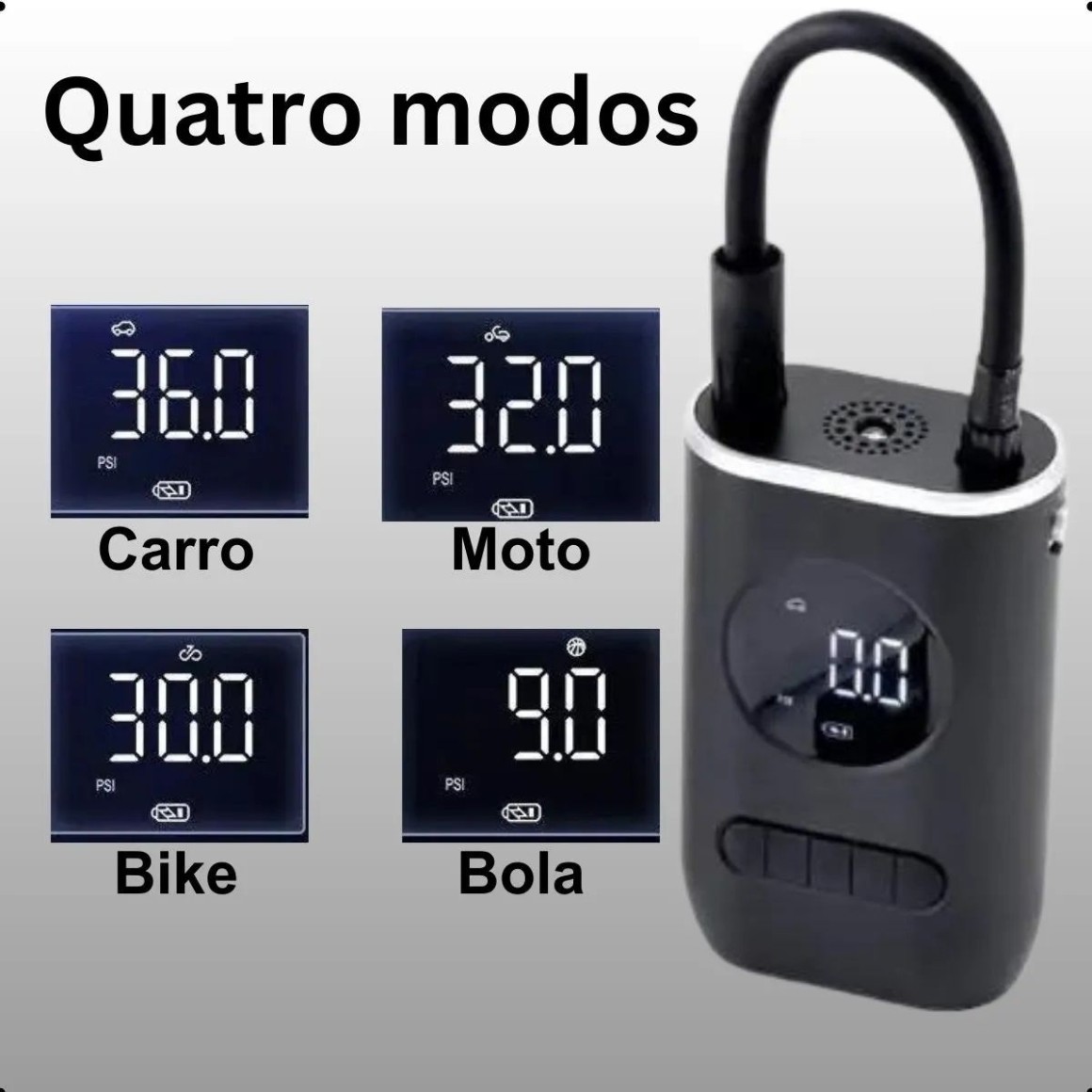 Bomba Compressor de ar portátil digital superpotente com lanterna, recarregável bivolt. Enche: Pneus de carros, motos, bicicleta, bolas etc. Produto compacto e potente, indispensável para ter em casa ou no carro. O Compressor é portátil e recarregável, conta com uma bateria de 2000 mAh x 2 com diversos modos predefinido. Para carro, moto, bicicleta e bolas. O melhor custo benéfico do mercado. Modo de uso simples e prático! Detecta automaticamente o PSI do pneu, basta selecionar o PSI ou bar desejado! Para maior comodidade o aparelho possui lanterna! INFORMAÇÕES TÉCNICAS: - Material: ABS - Atual: 10A - Potência: 50W - Fluxo de pressão de ar: 25l/min - Tipo de fonte de alimentação: TYPE-C - Comprimento do cabo de alimentação: 0.8m - Comprimento do tubo inflável: 0.5m - Quatro modos estão disponíveis: carro, bicicleta, carro elétrico, basquete - Tamanho aproximado: 15*9.5*7.2cm - Tamanho da embalagem: 17*11*10cm - Peso da embalagem: 525g - 5V - Utilizar com fonte Bivolt Conteúdo da embalagem: - 1 Bomba de Ar Elétrica Portátil Recarregável + Conjunto de Bicos