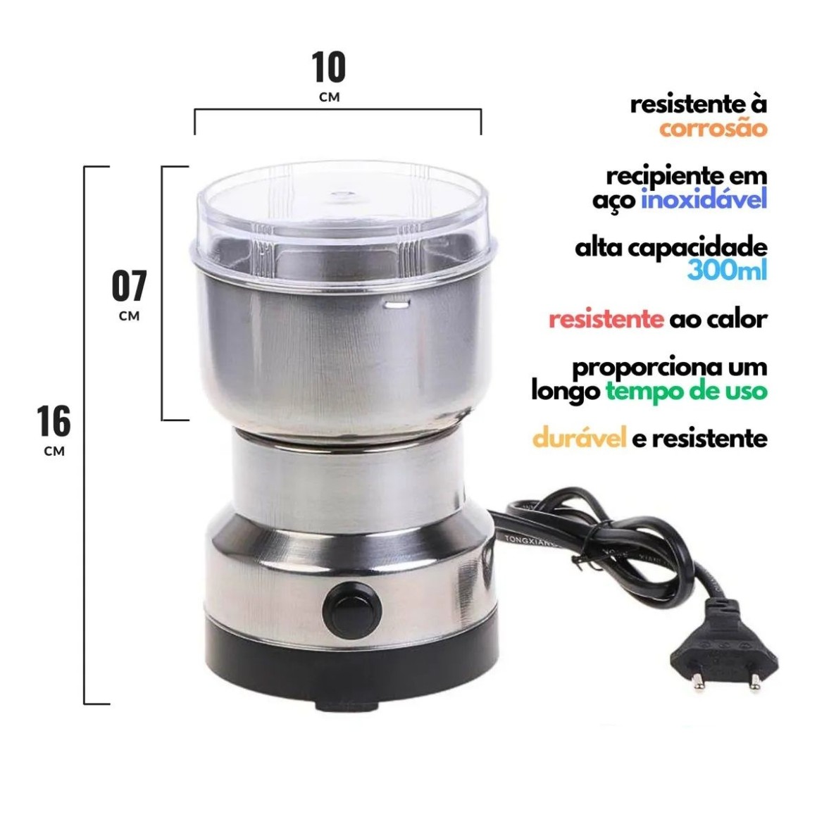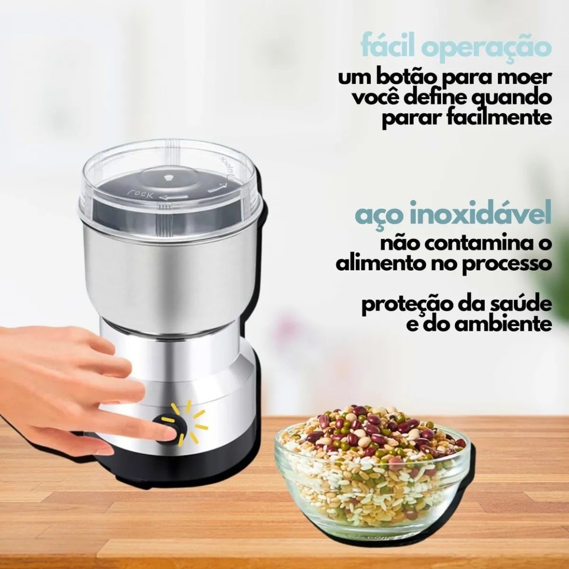- Potência de 150w para moer grãos de café, nozes, avelãs, amendoim, entre outros.
