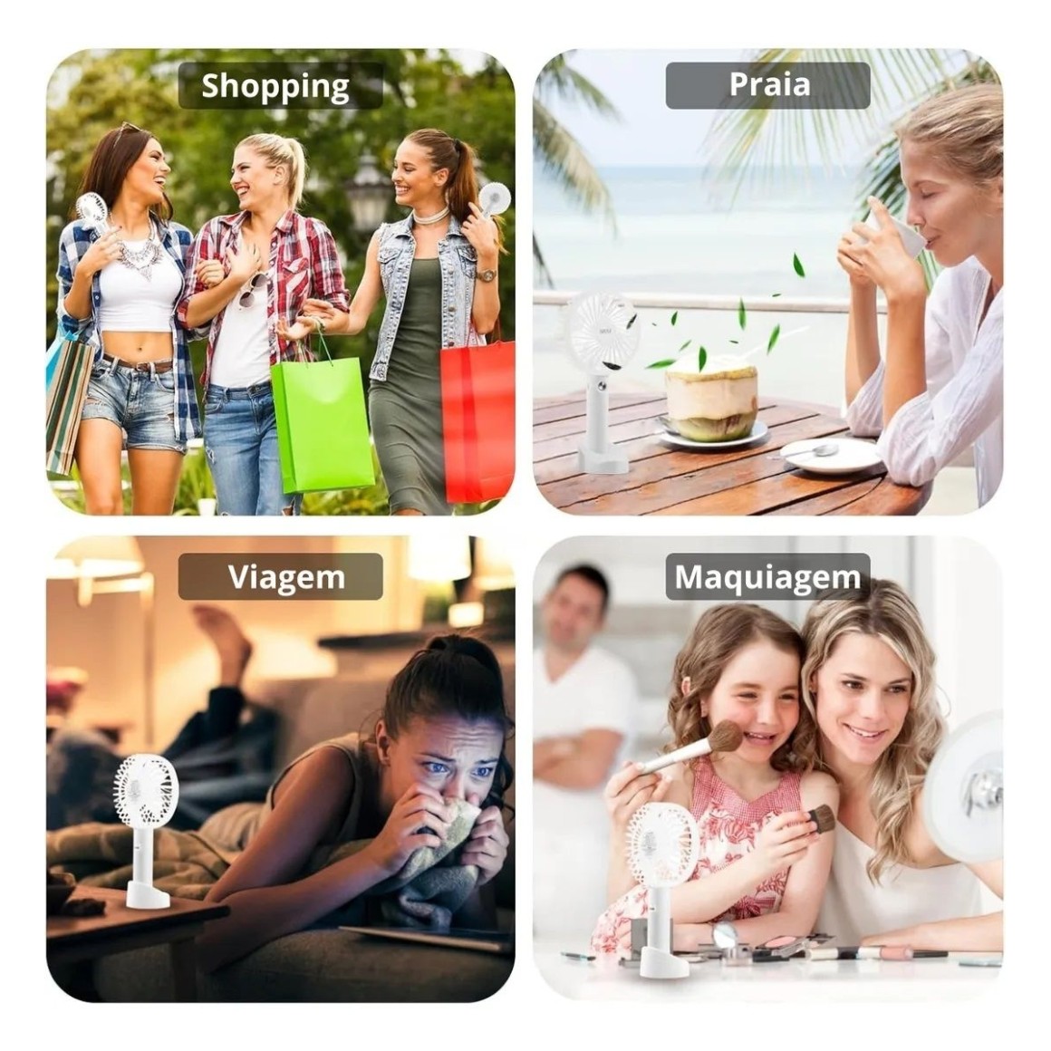 Acompanha: 1 ventilador + 1 base de apoio + 1 cabo USB + 1 bateria 1200mAh