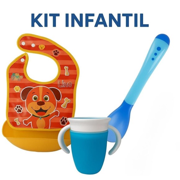 Kit Infantil Babador Pega Migalhas Colher Silicone Copo Azul