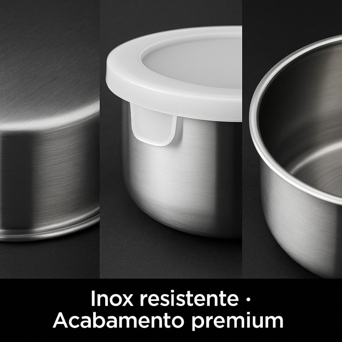 Deixe sua cozinha mais elegante, organizada e prática com este conjunto premium de potes em aço inox. Modernos, duráveis e versáteis, eles são perfeitos para armazenar, transportar e servir alimentos com muito mais estilo e higiene.